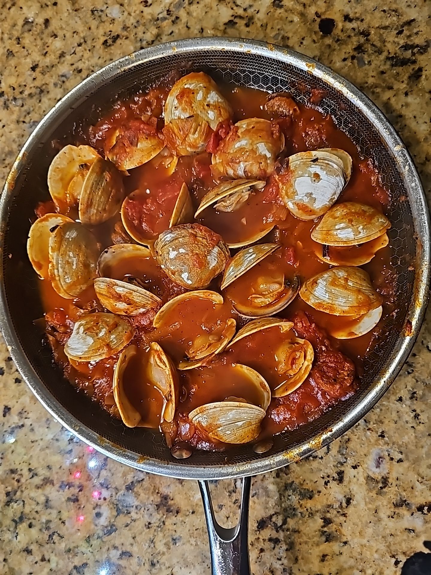 I took photos, removed the clams from their shells for ease of eating, added a dash of salt and pepper, tossed everything together, grabbed the toast, and curled up on the couch with my bowl, my dogs, and my current favorite British police procedural.