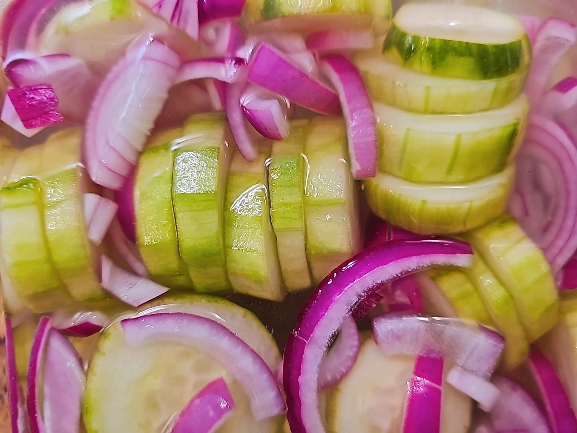 Step 2: An hour before the pork was done, I quick-pickled cucumbers and red onion in white vinegar, water, salt and sugar. Then came the fried shallots.