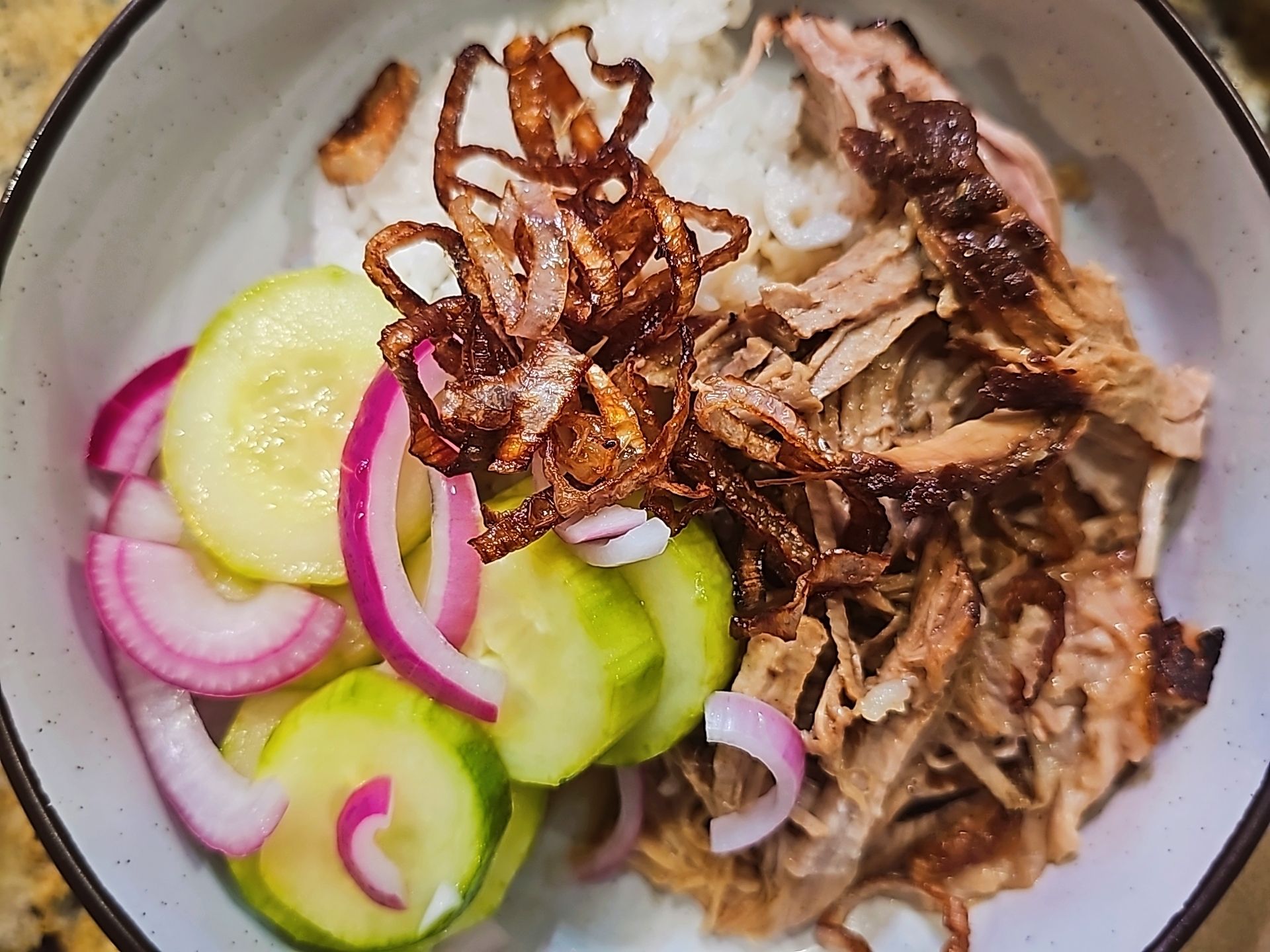 To serve: shred some pork, toss it with that absofuckingdelicious braising liquid, spoon rice into bowls, top with pickles and shallots.