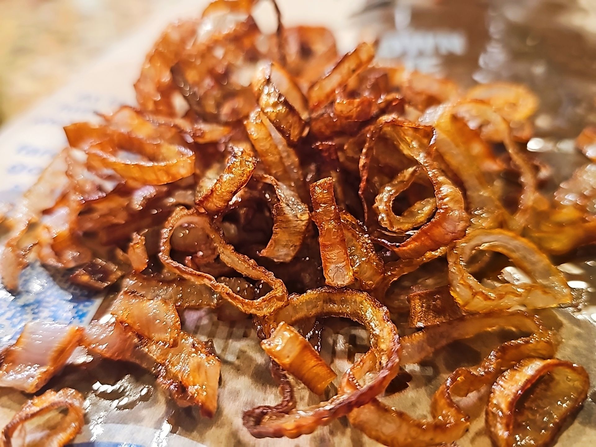 Step 3: Last week’s batch of the shallots was…less than perfect, so I adjusted: deeper pot, thicker slices (turns out “thin” is a sliding scale when hot oil is involved). Much better this time, though still nowhere near the 12–13 minutes the recipe promised.