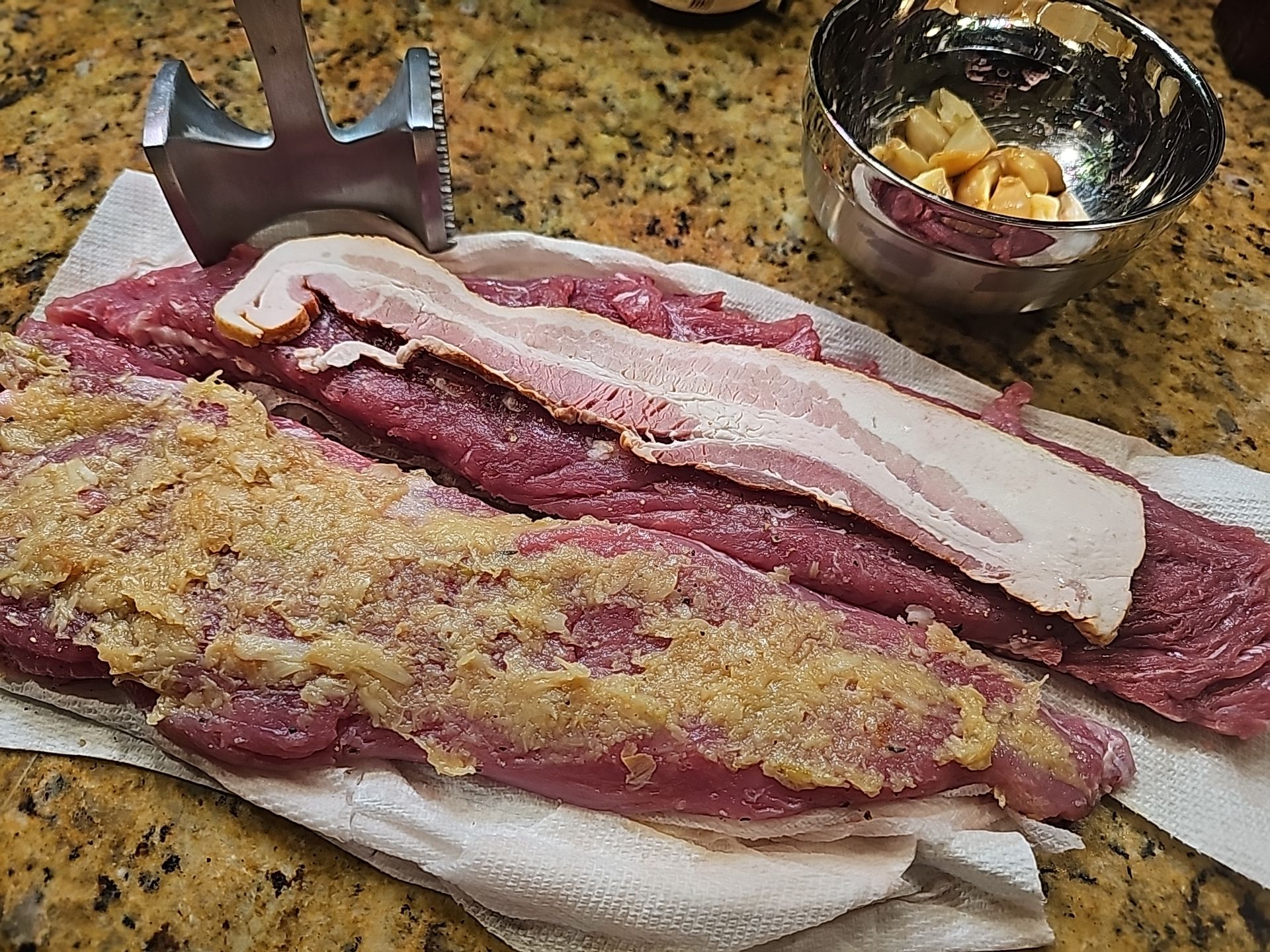 Spread the mashed garlic on one tenderloin, add a slice of bacon, then place the second tenderloin on top in a 69 position—narrow end to fat end—so the whole thing is roughly uniform in size.