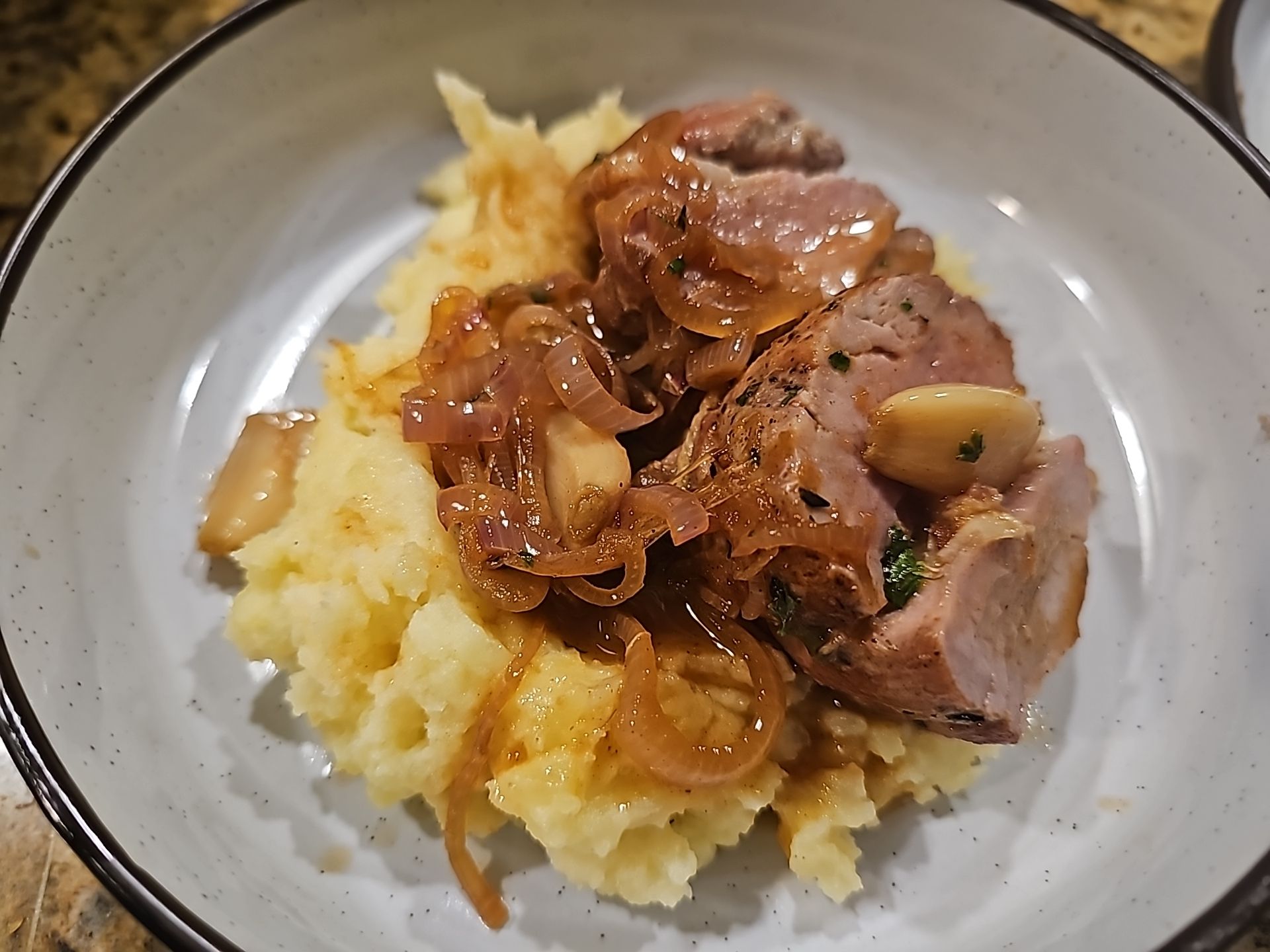 Transfer it to a roasting pan and slide it into a 350°F oven for 20–30 minutes, depending on thickness. I cooked mine to medium—145°F—then let it rest while I made the sauce and mashed potatoes.