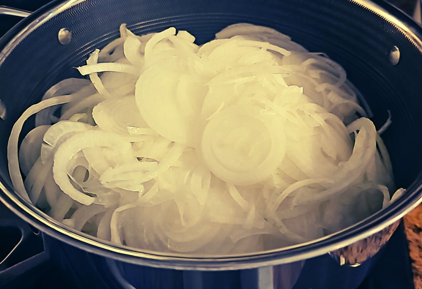 This version called for eight large onions. So I bought eight large onions. Peeled them, trimmed the roots, and sliced the fragrant orbs on my mandolin—the only tool that keeps the slices thin and even enough to cook properly.