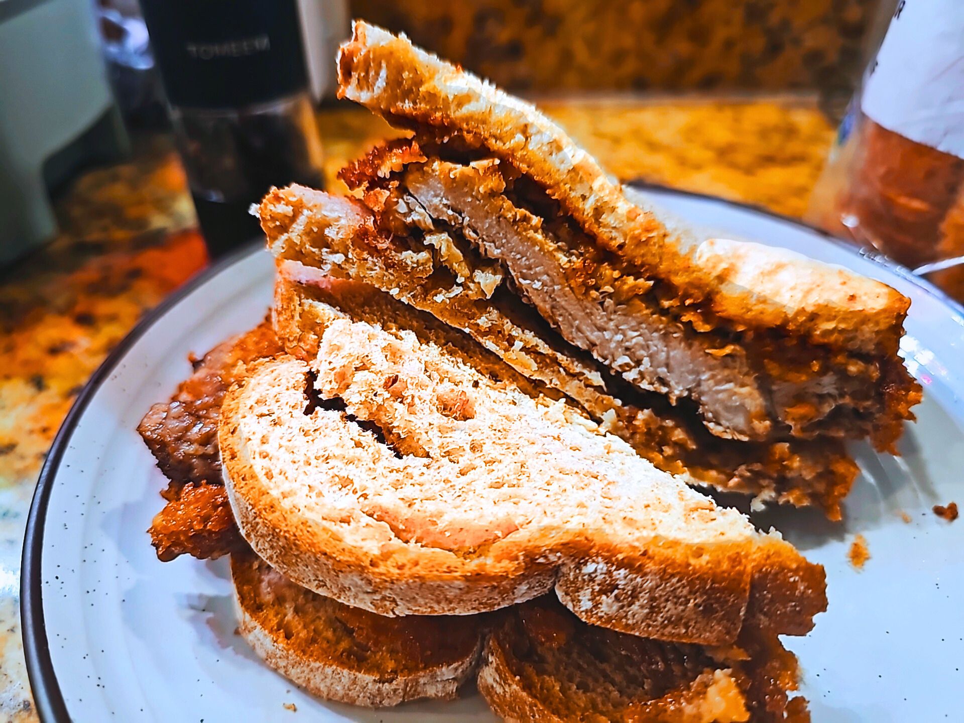 They weren’t beautiful. But the taste? Unbelievable. Because I pounded the hell out of them, the chops were as tender as mortadella. The three of us ate every bite—sandwich, salad, all of it.